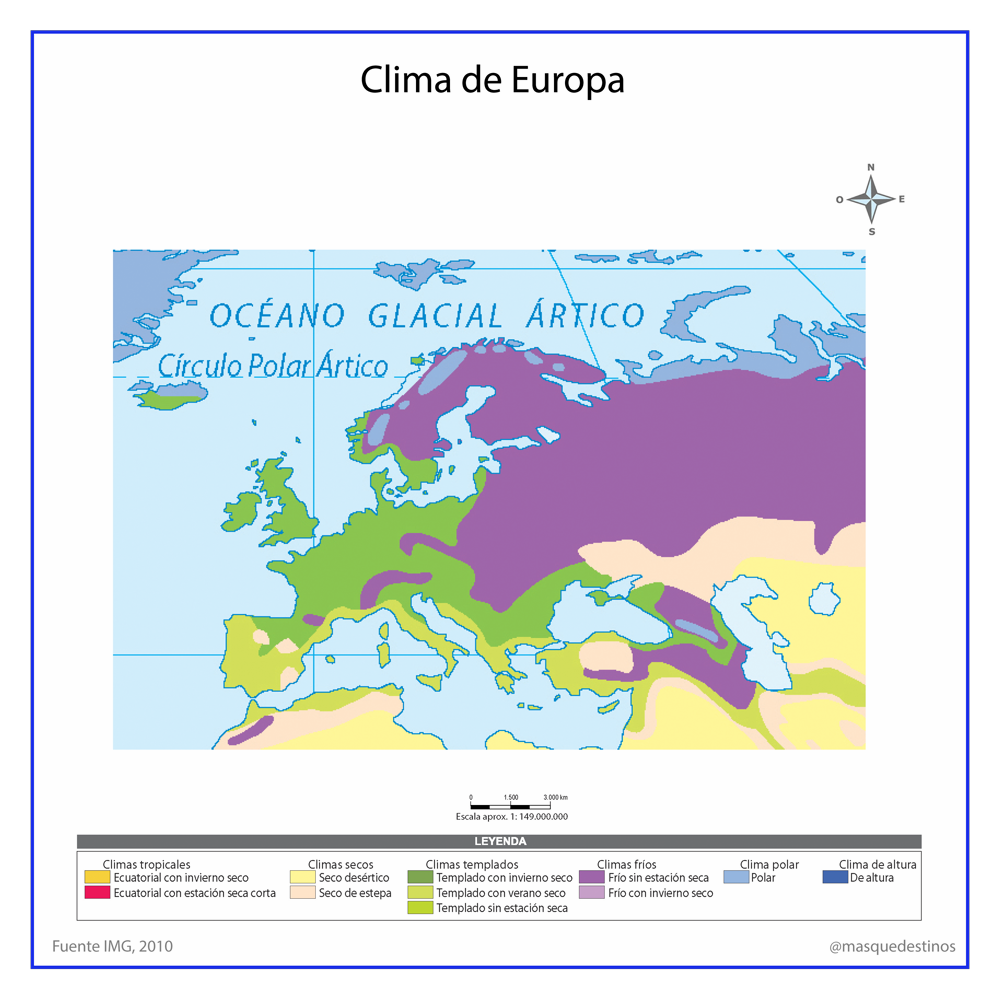 Europa tiene un clima mayormente templado, pero también puede presentar ciertas variaciones dependiendo de la región. Esto se debe a la latitud y la influencia de corrientes de aire polar marino y polar continental. En menor medida el aire tropical marino y tropical continental.